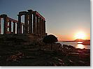 auf Kap Sounion die Sonne hinter dem Poseidon-Tempel zwischen den Landzungen im Meer. Wir haben